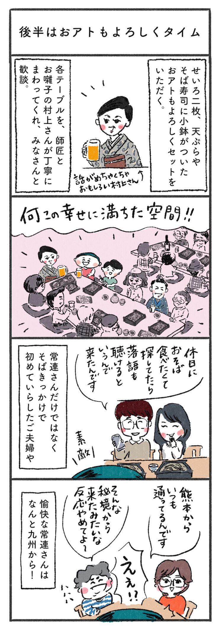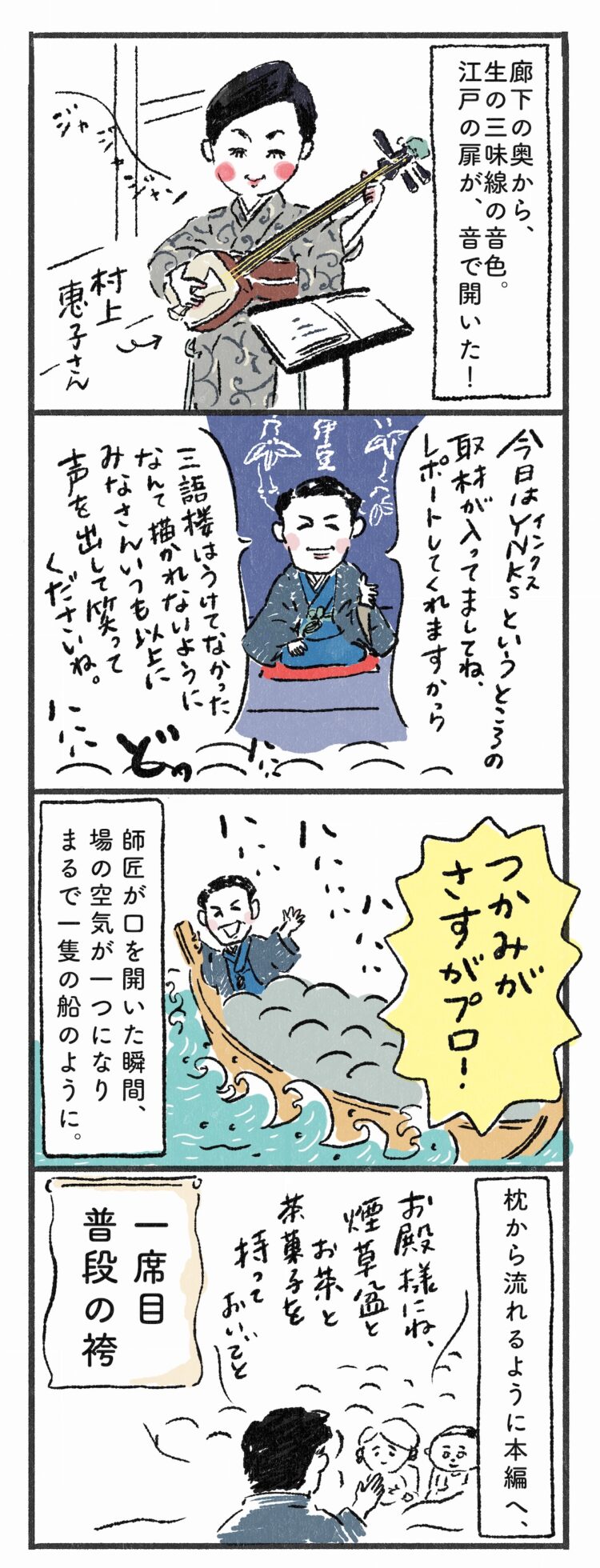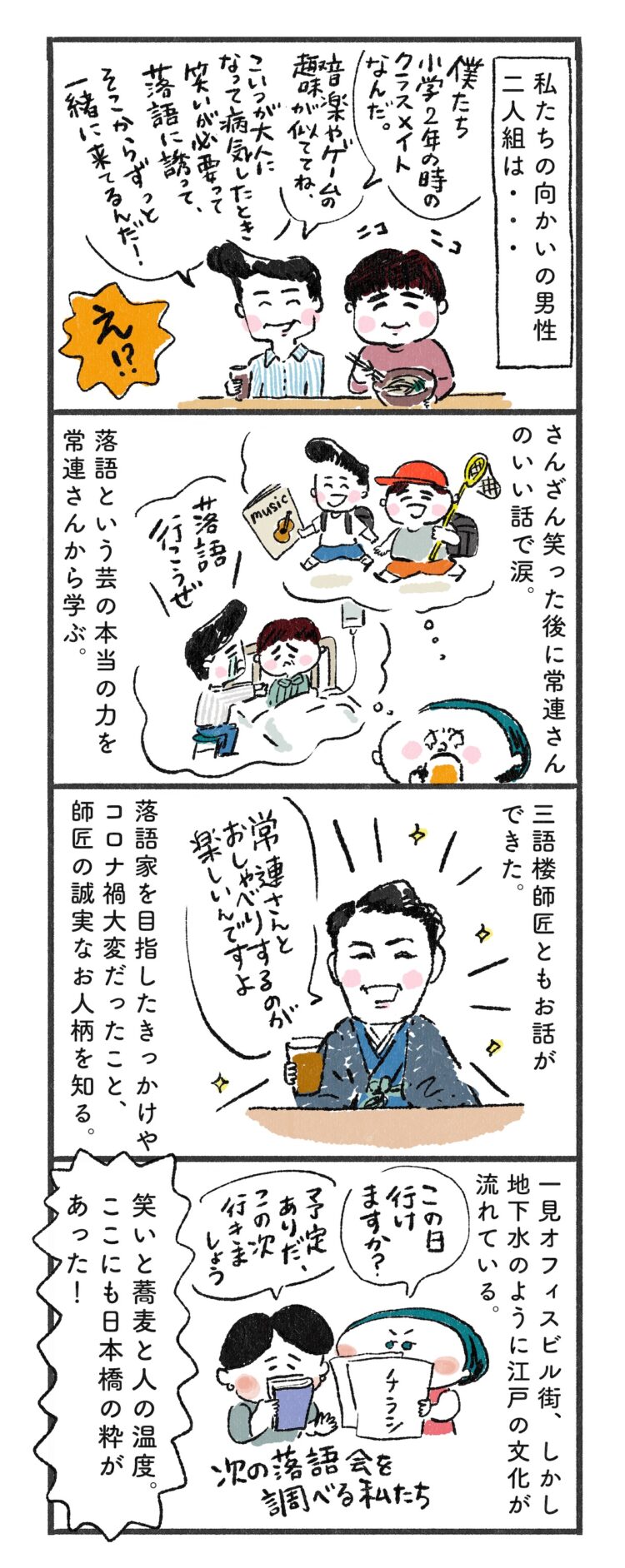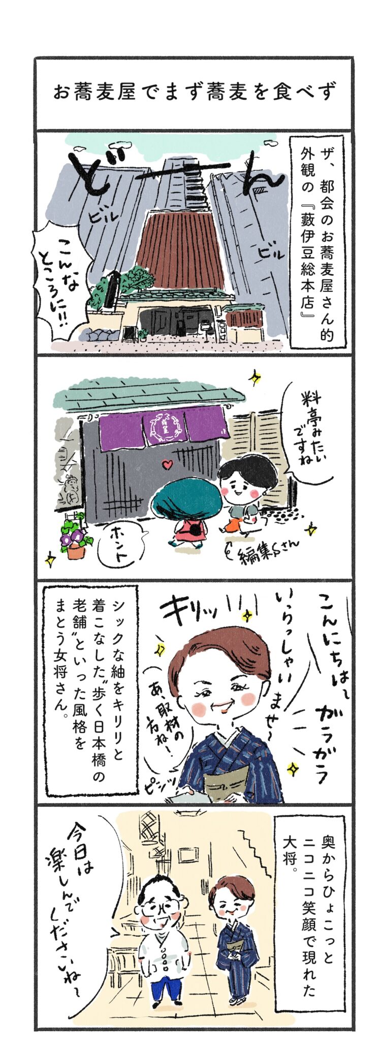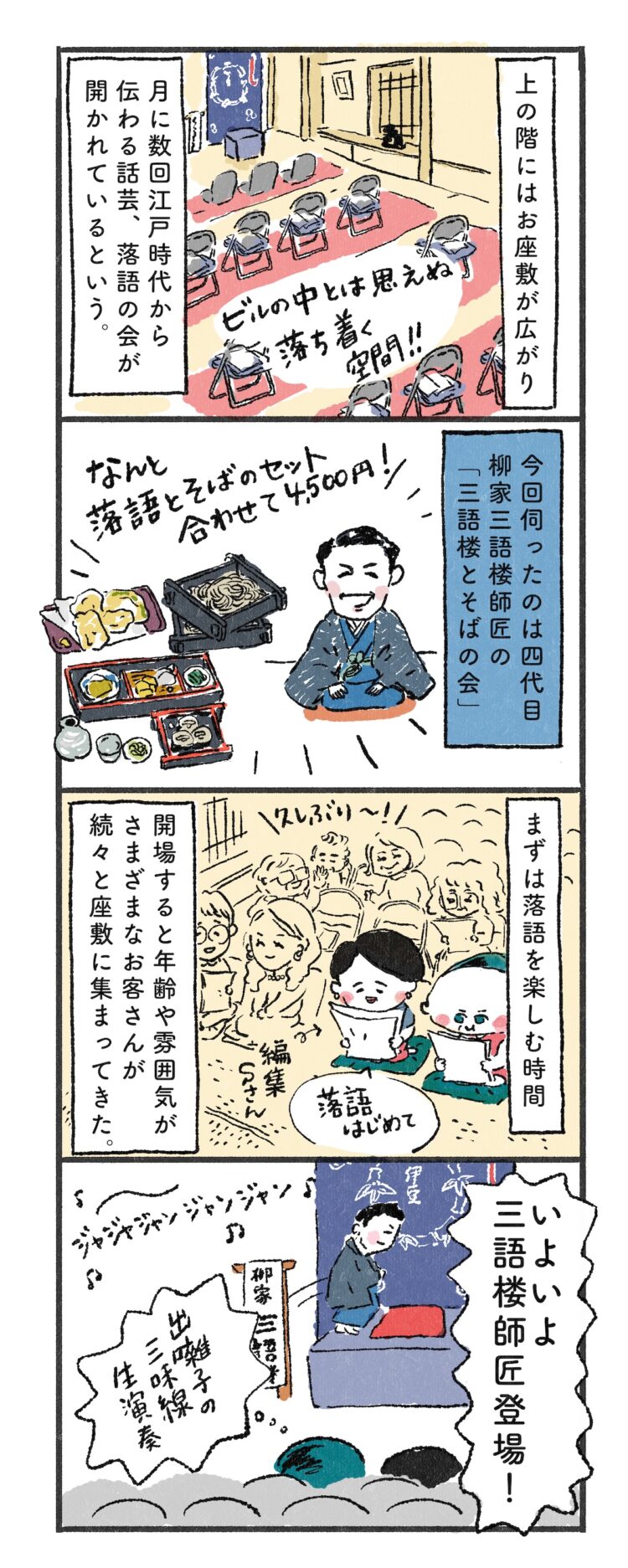 八重洲・日本橋・京橋エリアには、衣食住や趣味・仕事まで本物を知るおとながたくさん。イラストレーターの佐々木千絵が、このまちの”粋”を体験するイラストエッセイ。第8回は、日本橋の老舗そば店『藪伊豆総本店』の三階で開かれている、柳家三語楼さんの落語会へ。江戸の香り漂う座敷で蕎麦を手繰る芸を見、その後リアルに蕎麦をいただく。といった食と芸が立体的に交わる現場からレポートします。