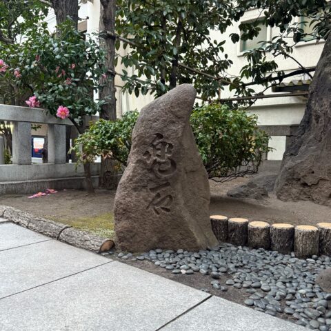 気になっていた兜岩を見るために、兜神社を訪れました。源義家が戦勝を願い、この岩に兜を懸けたことに由来し、「兜町」という町名もここから生まれたそうです。炎のような形が印象的で、不思議とパワーをもらえました。