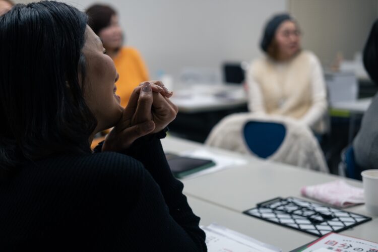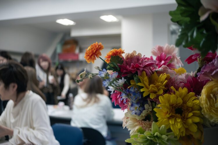 見渡してまず印象的だったのが、華やかな服装の方が多いことである。たとえば、鮮やかなオレンジのセーターに黄緑色のロングスカートを合わせていたり、赤いセットアップだったり、大胆なダメージジーンズだったり。髪色の明るい方や、大きくて派手なネックレスをしている方も多い。会場はどこにでもあるオフィスビルの一室なのだが、まるでパーティー会場のように華やいでいる。