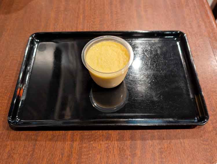 無機質なプラスチックにおさまったプリン。表面は固め。でも、スプーンですくうとびっくりするほどなめらか。市販のプリンかと思いきや、カフェのキッチンで作っているそう