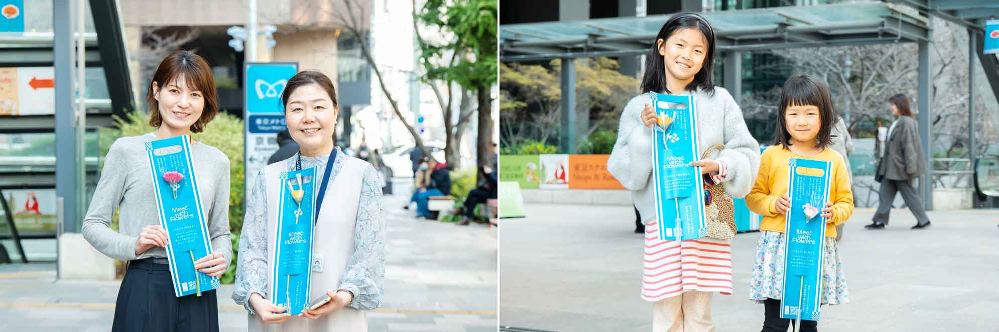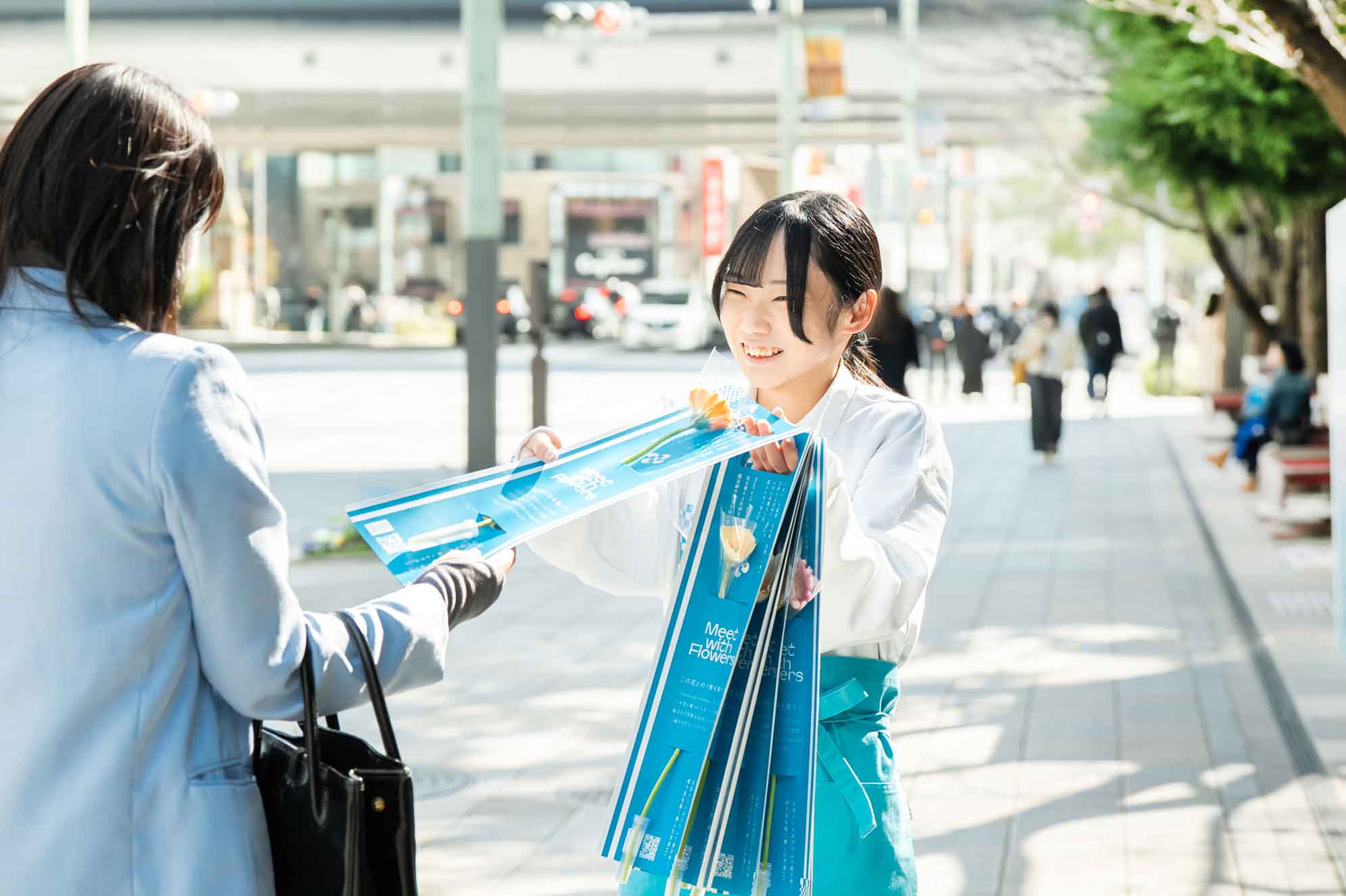 ビル前で花を配りはじめると、少しの戸惑いと驚いた様子の後で、笑顔で花を受け取ってくれた街ゆく人たち。外国人観光客やYNKエリアのビルに勤めるワーカーの姿も多く、中にはInstagramでこのキャンペーンを知り、立ち寄ってくれた人も。好きな色の花が選べることにも喜んでもらえて、楽しみながらセレクトしていました。