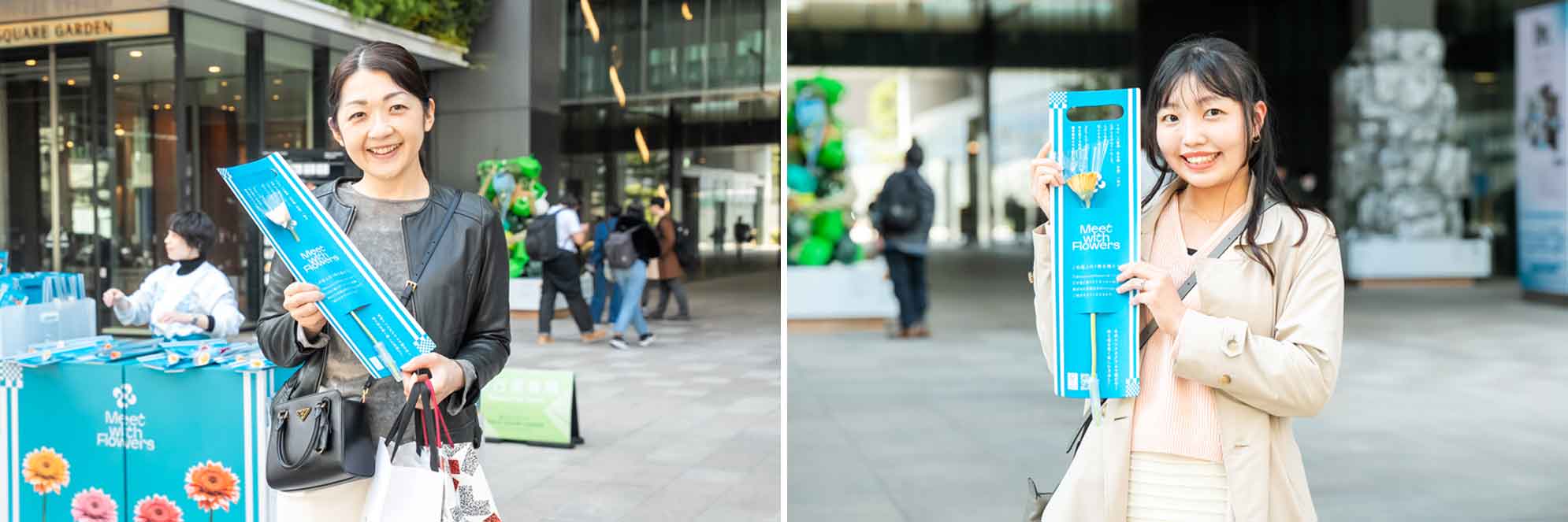 「Instagramでこのイベントは知っていたのですが、実際に受け取ることができて嬉しかったです。プリザーブドフラワーを習っていて、花はいつも家に飾っています。眺めるだけで気持ちが明るくなるのがいいですよね」(写真左)