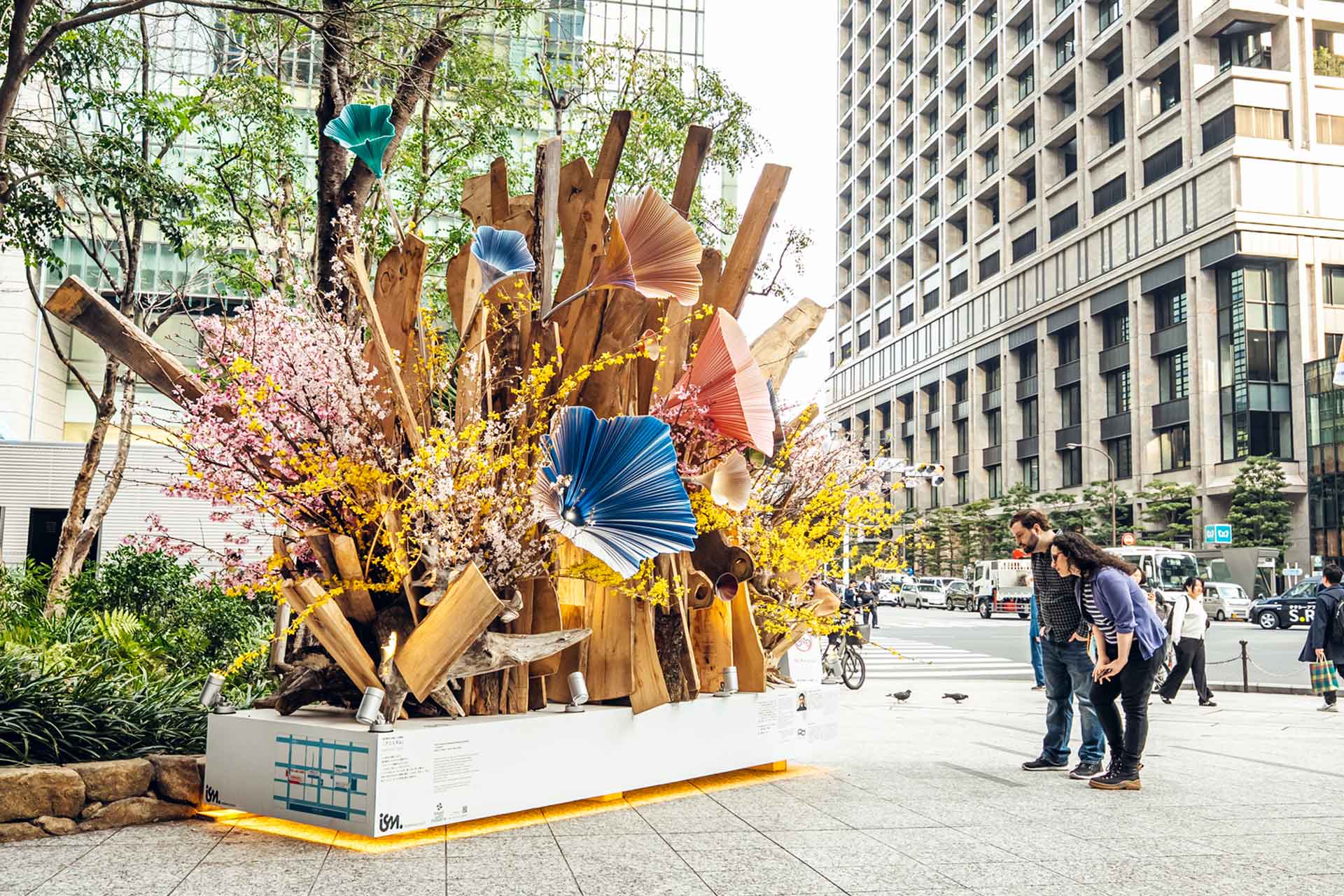 「Ikebana Project: “ism.”」総合ディレクターを務めた現代華道家の大薗彩芳氏の作品「コノハナサクヤヒメ」。色とりどりに開く大きな花は、3Dプリント・デザインのパイオニア「積彩(SEKISAI)」の技術を用いて製作。見る角度によって何色にも変わりゆく花びらが神秘的で、日本神話で桜の美しさを体現した女神とされる「コノハナサクヤヒメ」の羽衣のよう。またダイナミックに伸びる木々は、東京都唯一の山村であり大切な水源地でもある檜原村の森の守り人「東京チェンソーズ」の案内のもとで見つけた廃材を使用。東京建物日本橋ビルの敷地内、日本橋交差点の目の前に設置され、多くの人が興味深そうに立ち止まり、あらゆる角度から眺めていました。