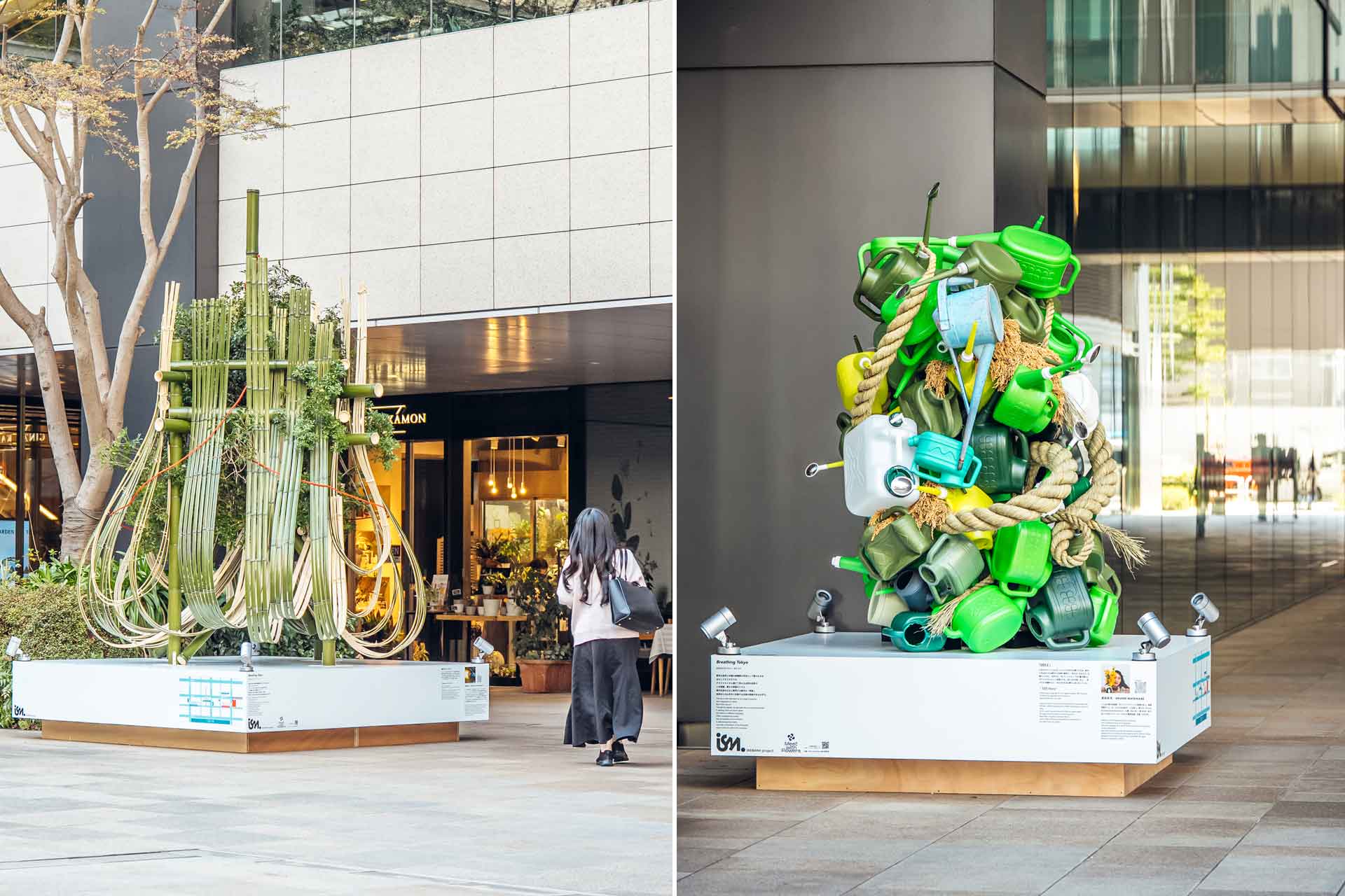 東京メトロ・京橋駅に直結する「東京スクエアガーデン」では「Breathing Tokyo」をテーマに、前期と後期で作品が入れ替わり計7つの作品が登場。招待作家、深澤隆行氏「都市のつくり手」(写真左)は、束ねた竹で人と都市の“共生と強制”を表現。ダイナミックな竹のしなりは凛と美しくも、適度な緊張感をはらんでいるよう。
