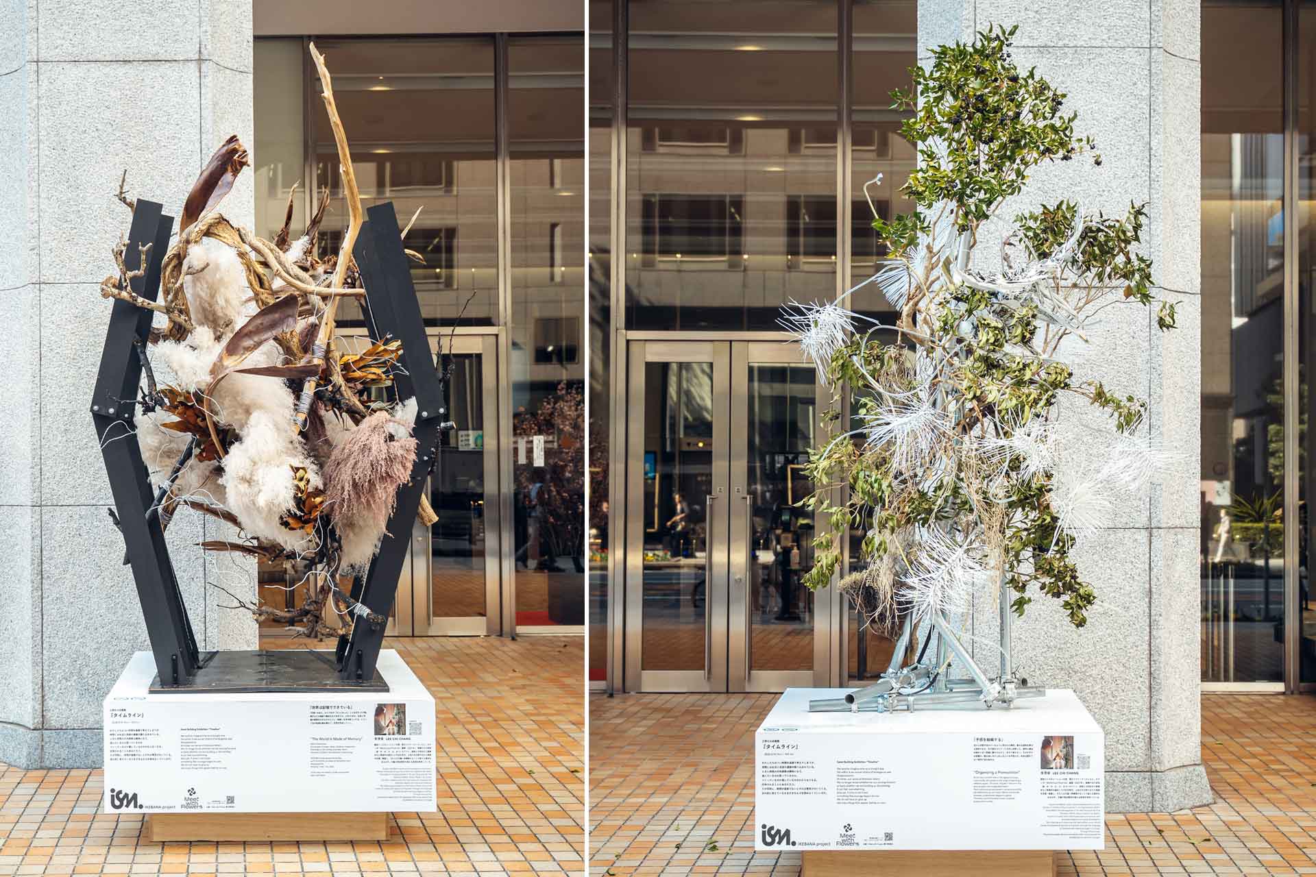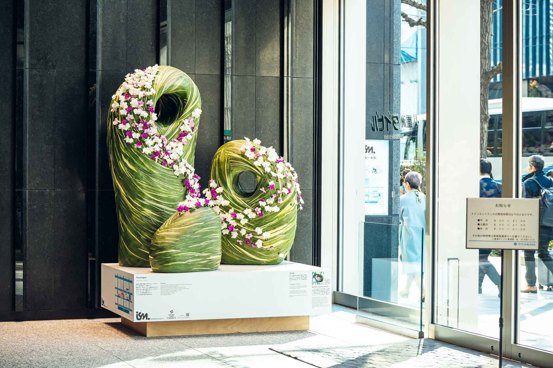 花を贈る「Send Flowers」と同時に行われたもうひとつのプロジェクト「Ikebana Project: “ism.”」いけばなの可能性を知ってもらうこと、いけばなの先入観を払拭することを主眼に、今から約100年前に自由な表現を求めていけばな草月流を創始した勅使河原蒼風のイズムを、展示を通して感じてもらうことを目指した取り組みです。YNKエリアの東京建物日本橋ビル、東京スクエアガーデン、三栄ビル、八重洲ダイビルに10人の華道家による作品が出現。総合ディレクターを務めた現代華道家・大薗彩芳氏による3Dプリントとの異分野コラボに挑んだ大作をはじめ、都市と人、時間、情報などをそれぞれテーマにした背丈以上もある壮大ないけばなアートにたくさんの人々が足を止め、見入っていました。